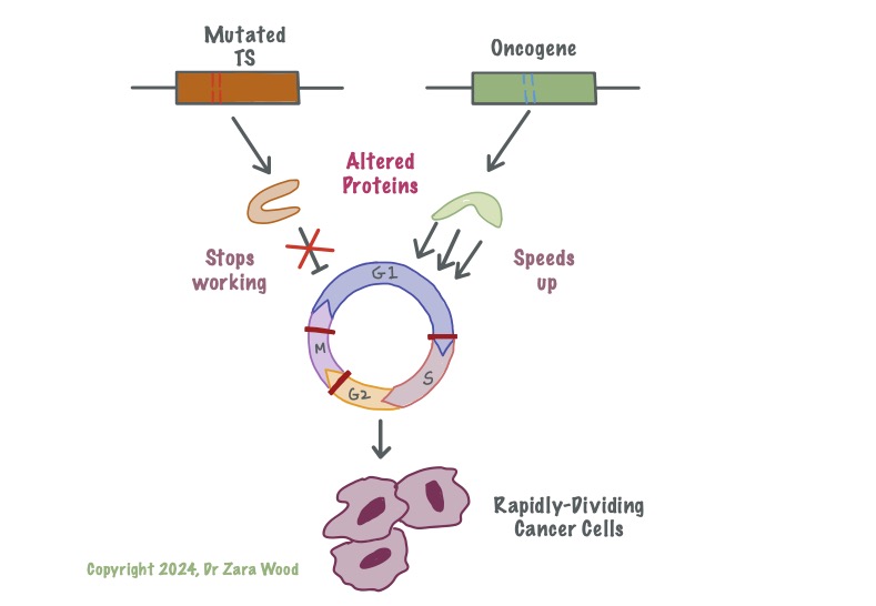 Mutation in the Tumour-suppressor genes means these genes no longer produce functional protein. Damage to one of the genes increases the risk of cancer, but leaves cells with one functional copy. Damage to both copies disrupts the cell’s ability to slow down the cell cycle – i.e. mutation in both copies of Tp53 gene means cells are no longer able to respond to DNA damage or oxidative stress. This allows cells with faulty DNA to continue to multiply. Proto-oncogenes are turned on at critical junctions, in response to internal or external signal proteins. A photo-oncogene with a mutation is called an oncogene. This oncogene might produce protein that is no longer under the control of the signal protein, and remains activated at all times. This can lead to uncontrolled cell division. Cells with mutation in either gene are able to outcompete healthy body cells for oxygen and nutrients, suffocating the healthy cells and causing cell death – this is cancer.