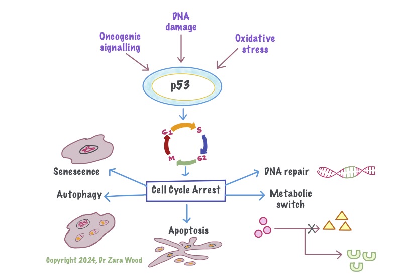 p53 is a tumour-suppressor gene, that down-regulates the cell cycle. For example, damage to DNA can trigger cell cycle arrest between the G1 and S phase. This gives time for the repair enzymes to repair DNA. If the DNA cannot be repaired, the apoptosis pathway is activated, which is a form of programmed cell death. Apotosis causes minimal damage to surrounding cells. Metabolic stress, like exposure to free radicals, or aging, can trigger autophagy or senescence in cells. They are generally considered tumour-suppressive, but in some cases can lead to chronic inflammation which damages surrounding tissue.