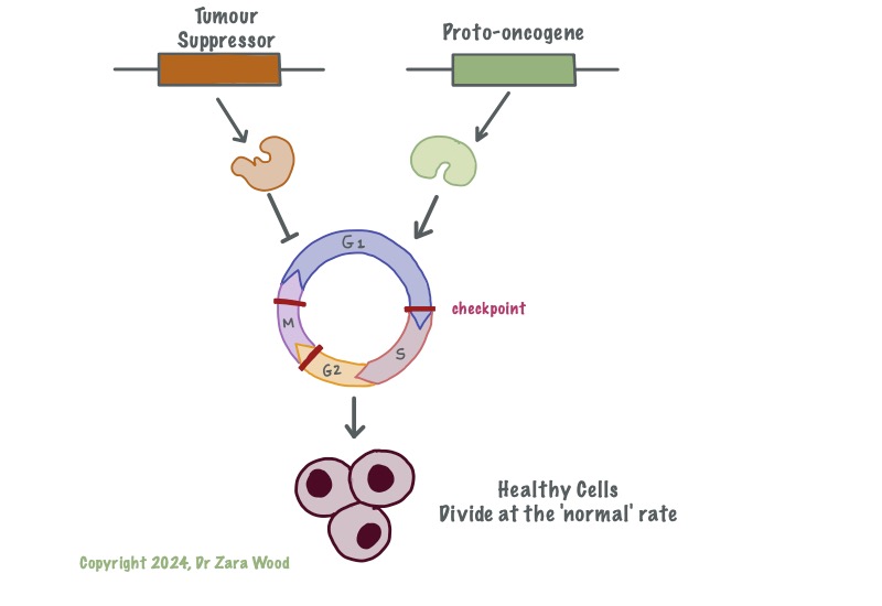 Tumour-suppressor genes act as down-regulators of the cell cycle, ensuring repairs are made before the cell proceeds to the next stage of the cell cycle. Tumour-suppressor genes are permanently switched on, and each cell has two functional copies of these genes. Proto-oncognes act as up-regulators of the cell cycle, ensuring it does not stall. Proto-oncogenes are turned on at critical checkpoints, this is usually in response to either internal or external signal proteins.